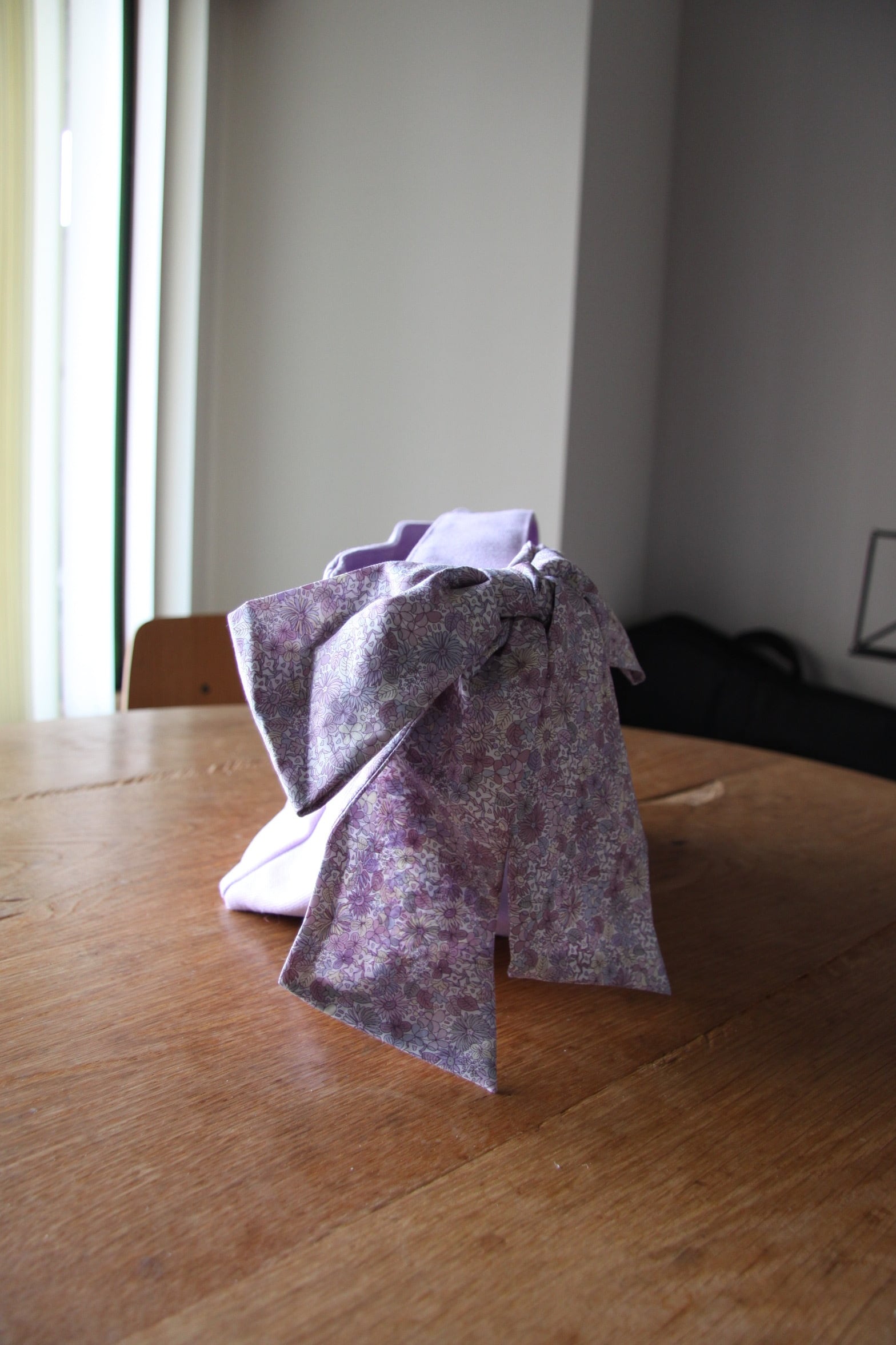 カラー すみれ色と花柄リボンが魅力的で、シンプルなファッションに華やかさをプラスします。