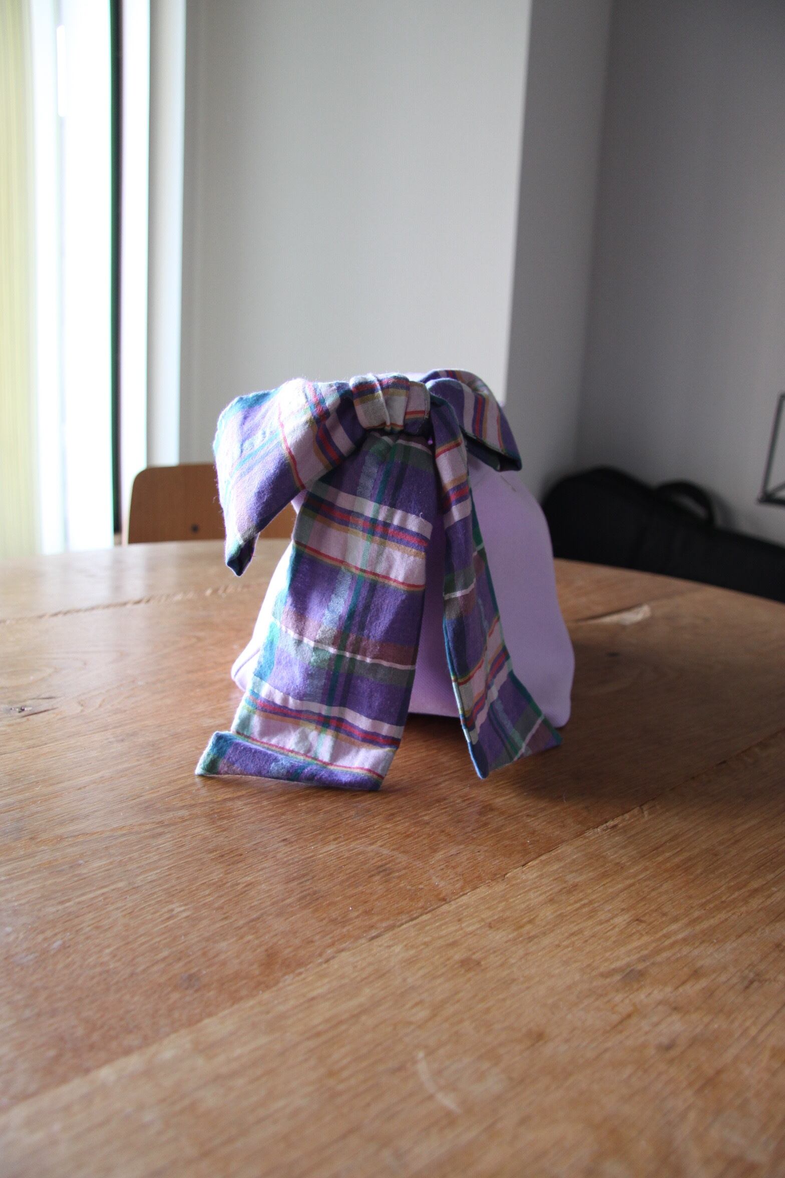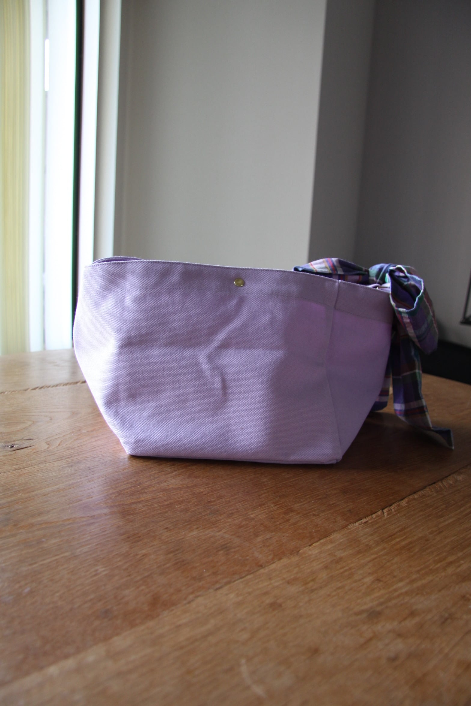 カラー すみれ色とチェックリボンの組み合わせが魅力で、シンプルなファッションに華やかさをプラスします。